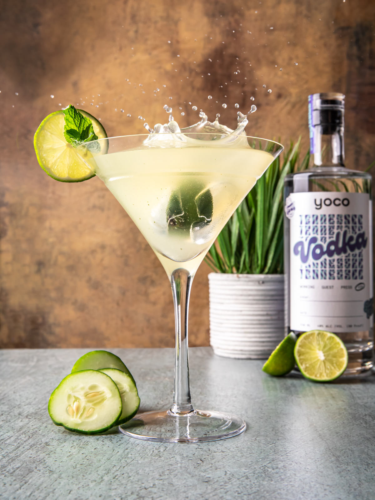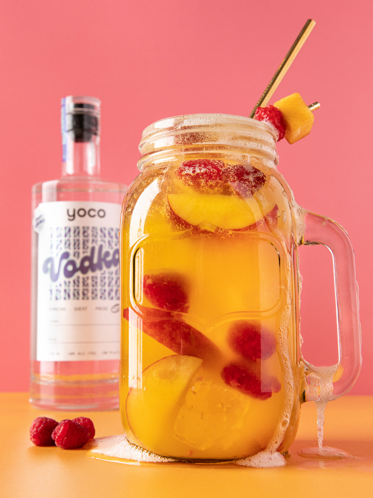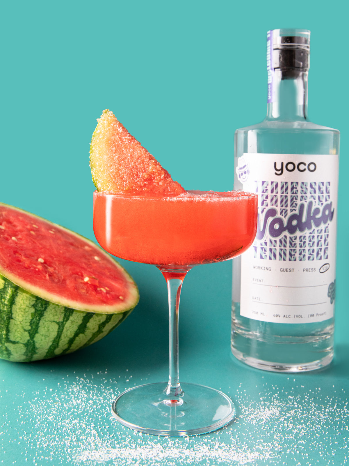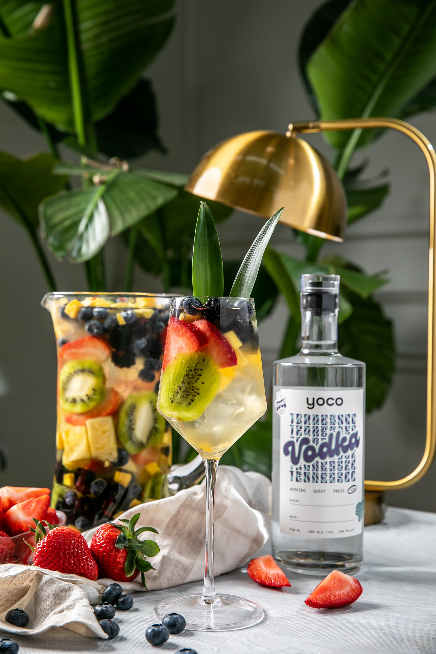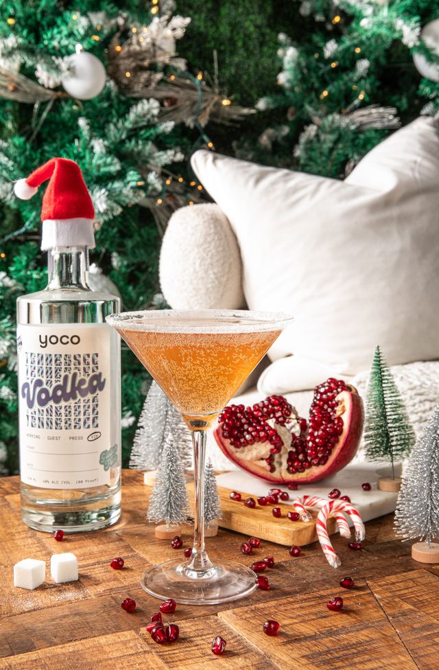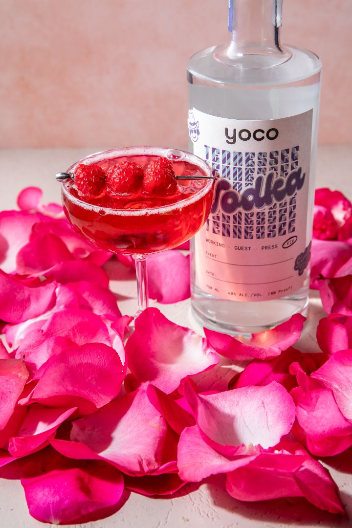 Combine YoCo Vodka and Pomegranate or Cranberry Juice in a shaker with ice. Shake vigorously and strain into a coupe glass. Top with Champagne and add garnish of raspberries.