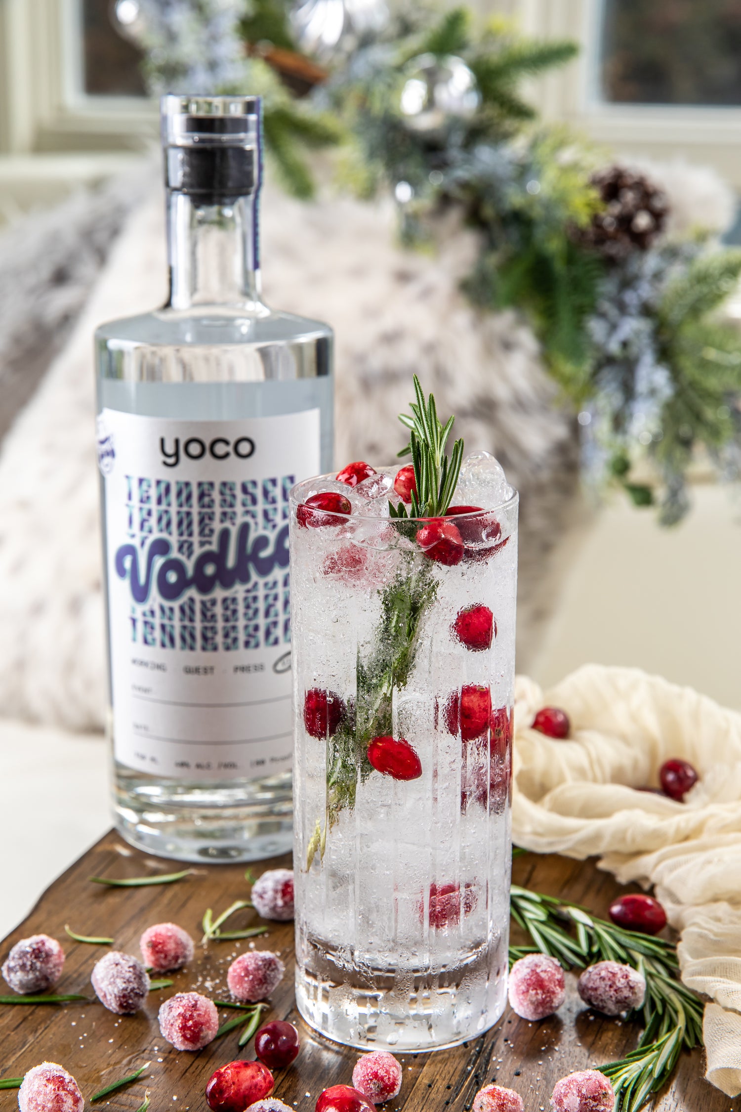 Directions:Pour vodka over ice in a collins or highball glass, add soda water, cranberries, and garnish with rosemary. Enjoy!